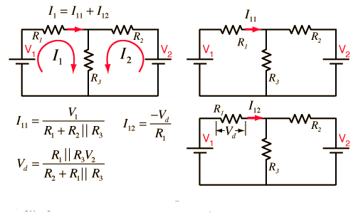 | Sobreposição: Caso de Duas MalhasPara aplicar o teorema da sobreposição para calcular o valor da intensidade de corrente através da resistência R1 no circuito de duas malhas mostrado, calculamos a corrente fornecida individualmente por cada uma das fontes sendo, nessa situação, a outra fonte substituída por um curto-circuito.  Nota: Para evitar trabalhar com tantos curto-circuitos, as resistências com valor zero passam a 1 por defeito quando uma tensão é modificada. Poderá ser mudada novamente para zero se pretender explorar os efeitos dos curto-circuitos. Ohms e amperes são as unidades por defeito, mas se entrar com valores de Rs em kilohms, então as correntes virão em miliamperes. |