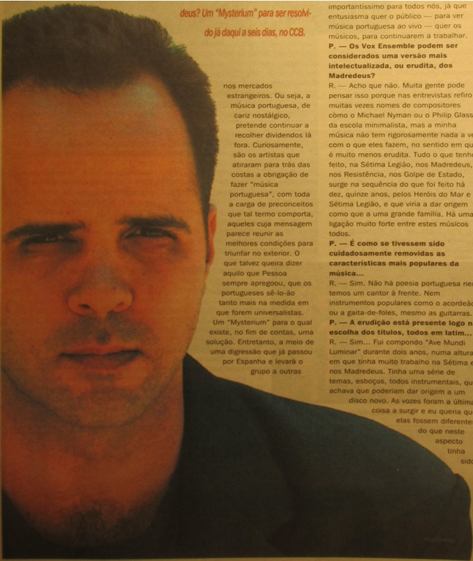 R. – Acho que não. Muita gente pode pensar isso porque nas entrevistas refiro muitas vezes nomes de compositores como o Michael Nyman ou o Philip Glass, da escola minimalista, mas a minha música não tem rigorosamente nada a ver com o que eles fazem, no sentido em que é muito menos erudita. Tudo o que tenho feito, na Sétima Legião, nos Madredeus, nos Resistência, nos Golpe de Estado, surge na sequência do que foi feito há dez, quinze anos, pelos Heróis do Mar e Sétima Legião, e que viria a dar origem como que a uma grande família. Há uma ligação muito forte entre estes músicos todos.