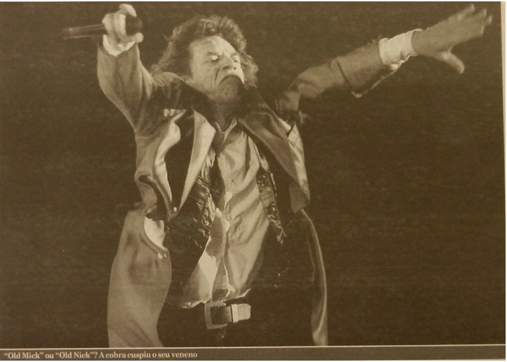 Em termos visuais, depois da cobra de metal que se erguia de um dos lados do palco, já ter cuspido um jacto de chamas, o primeiro grande momento acontece durante “Sparks will fly”, “trompe lóeil” luminotécnico em que as luzes de palco se prolongam pelo espaço virtual criado no gigantesco ecrã (o termo técnico é “jumbotron”) instalado atrás dos músicos. À explosão de luzes segue-se de imediato a explosão de meia centena de milhar de gargantas que entoam em coro cada verso de (I can’t get no) Satisfaction”, o “single” de 1965. Ilusão ou não, foi impossível não sentir um arrepio ao ver Jagger vociferar e correr como um possesso, como se, passados 30 anos, ainda conservasse a mesma insatisfação e a mesma raiva. Estava instalada a cumplicidade. A partir daí Jagger estabeleceu várias vezes com o público aquele tipo de comunicação só possível num concerto de música rock, a qual consiste na emissão e recepção de urros entre o artista e a assistência. O tribalismo na sua versão mais mediática. Chamam-lhe “show business”.