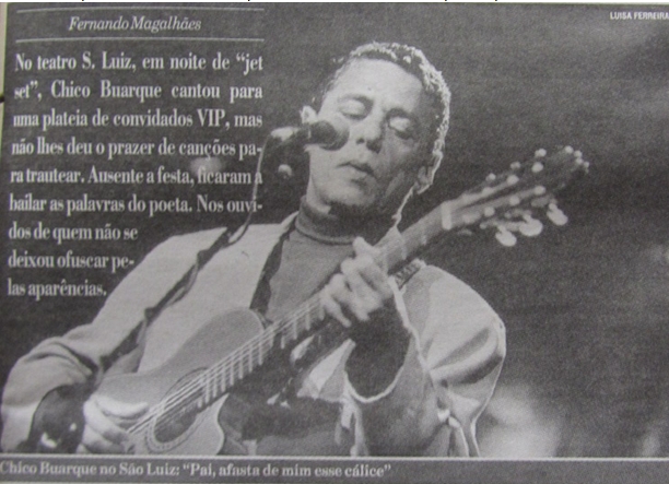Além do “homem das sete cordas”, uma figura feminina vestida de negro, postada diante de um sintetizador, chamava as atenções, do lado esquerdo do palco. A Minela, cantora que desde há alguns anos vem acompanhando Júlio Pereira, cabe uma quota parte importante na peça sonora que se vai desenrolar amanhã. É ela quem tece no sintetizador o ambiente de cada canção. É dela sobretudo uma voz que se ergue e nos espanta. Uma voz que cada vez mais sentimos necessidade de escutar noutros contextos, um pássaro que gostaríamos de ver voar por outros céus. O falado, quase segredado, projecto de Minela com Teresa Salgueiro, Filipa Pais e a galega Uxia não consegue passar das intenções. Tem havido troca de impressões, todas se mostram interessadas mas nenhuma se atreve a dar o primeiro passo. A cantora galega é das quatro quem se tem empenhado mais em levar a ideia por diante. E as portuguesas, têm medo? Minela refugia-se dizendo que “tem que ser uma coisa muito bem pensada, que tenha qualidade”. Júlio Pereira, passa por ela, ri-se e dispara: “o que prova que os galegos têm mais garra do que nós!”
