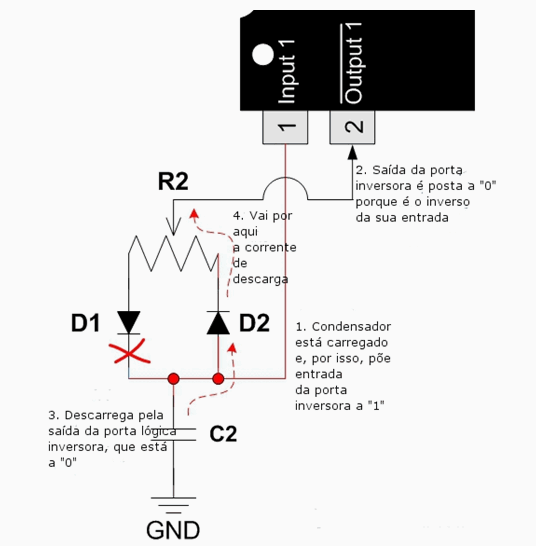 Quando o condensador está totalmente descarregado, a saída do inversor carrega o condensador. Quando o condensador está totalmente carregado, a saída do inversor descarrega o condensador, isto é, o condensador descarrega-se por/através dela.
