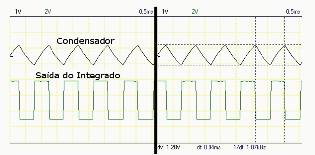 O osciloscópio mostra um gráfico tipo dente-de-serra, típico do ciclo de carga-e-descarga do condensador e a onda quadrada de largura variável que aparece na saída da porta lógica do integrado.