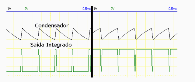 Como, assim, aproximadamente o mesmo valor de resistência é utilizado, quer para a carga quer para a descarga do condensador, o tempo a “ON” e a “OFF” é o mesmo.